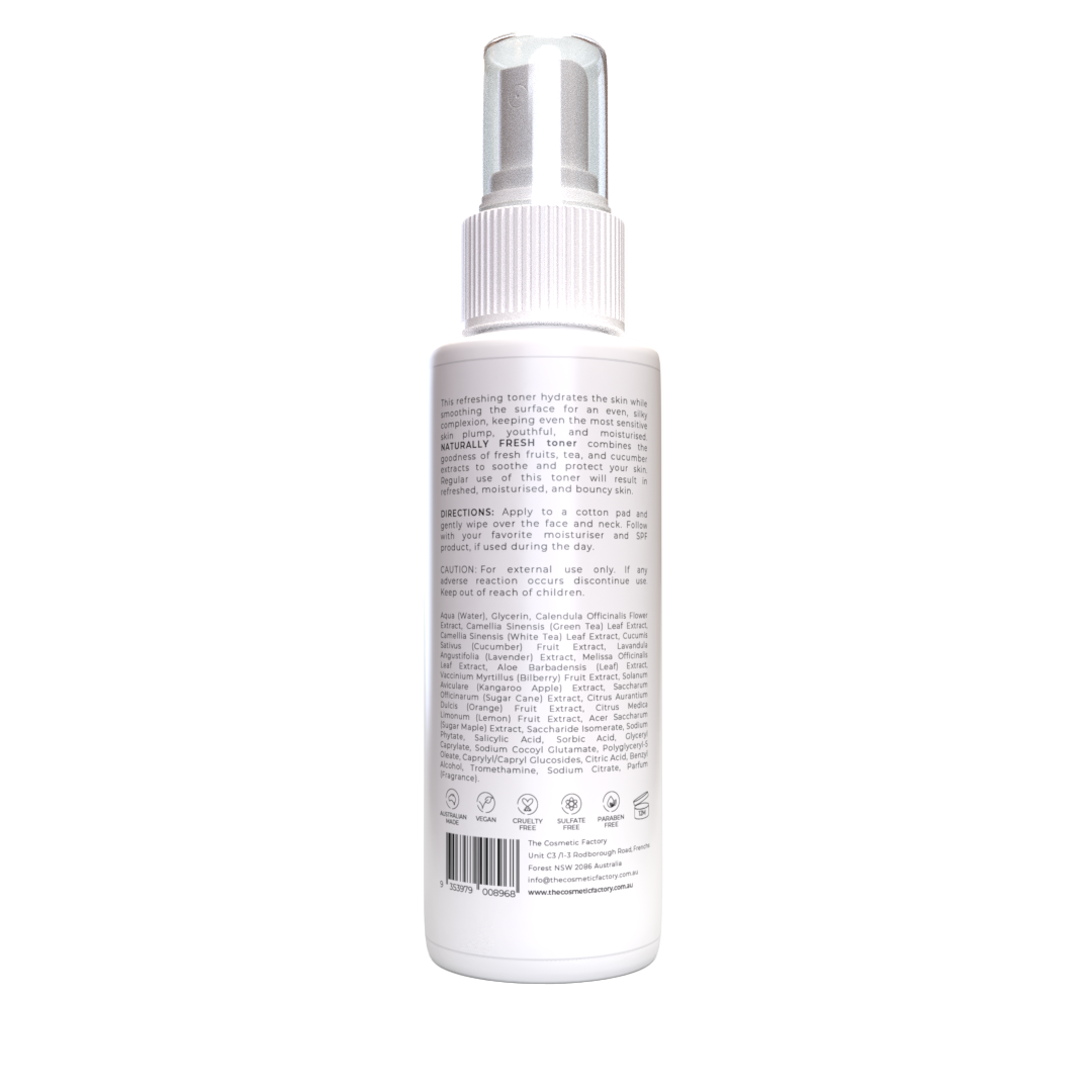 this refreshing toner hydrates the skin whilst smoothing the surface for an even, silky complexion, keeping even the most sensitive skin plump, youthful, and moisturised. NATURALLY FRESH toner combines all the goodness of fresh fruits, tea and cucumber extracts to soothe and protect your skin. Regular use of this toner will result in refreshed, moisturised and bouncy skin.